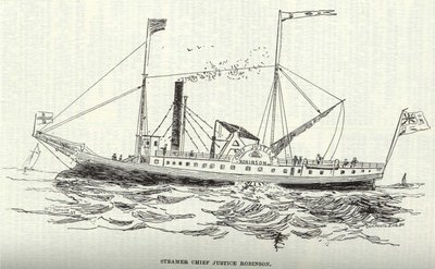 Commencing January 8th, 1855, the Chief Justice began to run for the winter, from the Queen's wharfToronto, to Niagara. On the morning of February 7th, the steamer Chief Justice, in endeavoring to make the Humber harbor, the weather being thick, hazy and snowy, it being impossible to see a hundred yards ahead of the vessel, kept too far up the lake and grounded at Van Every's Point, about one hundred and fifty yards from the shore. The mate immediately left for Toronto to consult Captain Dick. Two days later the Toronto Patriot announces:--"The steamer Chief Justice is off and all right and will leave on her regular trips to-morrow at 8:30 a. m. for Lewiston." The steamers Zimmerman and Welland went alongside of her on the morning of the 9th, shifted her cargo on to the Welland, then all three boats backing off together, the Chief came off at once without any trouble and without suffering any damage. On March 14th the Maple Leaf, Captain Robert Kerr, commenced the season between Toronto and Rochester. She left the former port each Wednesday and Saturday. Throughout the season of 1855, the Europa, a new steamer, ran from Hamilton to Niagara, and the Welland, as in the preceding year. The Peerless and the Zimmerman formed the Toronto and Niagara line. In a great storm which occurred on Lake Ontario on April 18th, in this year, the schooner Defiance, Captain Corkin, was lost with all on board. The steam tug Porcupine, on May 19th, was burned to the water's edge on the river St. Lawrence, near Prescott, but happily no lives were lost. The steamers Champion and May Flower formed the Cape Vincent line. The Chief Justice was commanded by Captain Murdock, a new man among the list of captains, and ran, as previously, from Toronto to Hamilton. The Highlander and Maple Leaf formed the line that ran from Toronto to Rochester, and there was no change in their commanders.