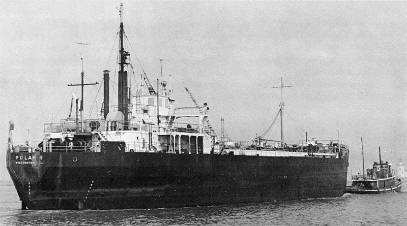 GEORGIA tows POLARIS out of Cleveland harbour en route to Ashtabula for scrapping on May 25, 1977. Photo by Alan W. Sweigert.