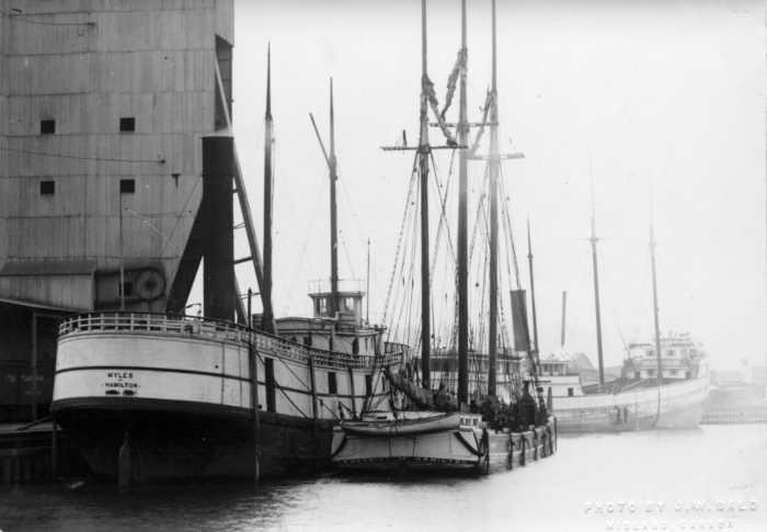 The propeller MYLES and the schooner T.R. MERRIT unloading grain at the "Town House" Elevator in Midland. Photo: Author's Collection