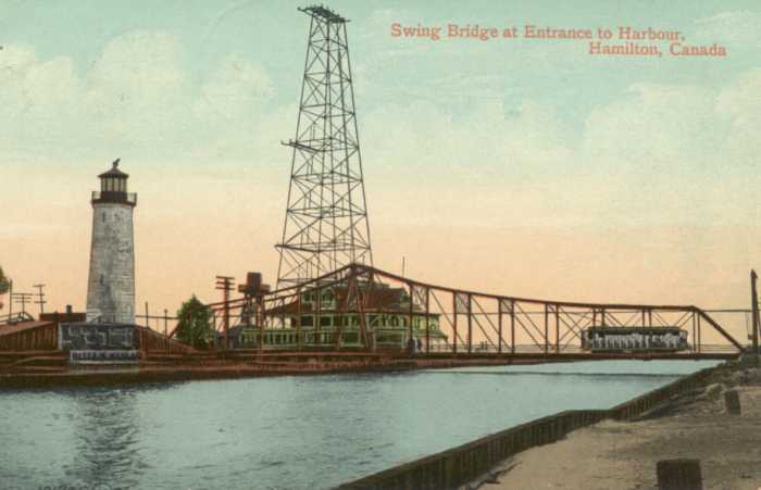 The bob-tailed swing bridge with a car of the Hamilton Radial Electric Ry. crossing to Burlington Photo: Author's collection